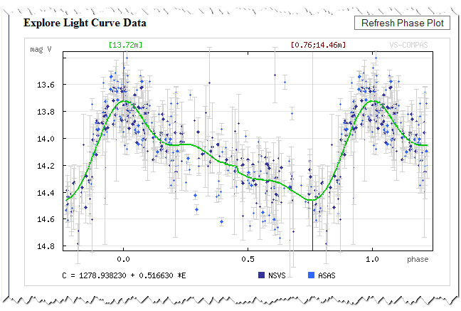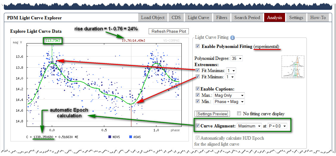 Having those extremums analytically identified allows to use this data for an automatic phased light curve alignment. This is very useful from all the points, since it can serve as an unbiased helper in an initial epoch (means phase "zero", the start of the cycle) determination.